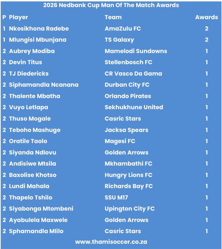 2026 Nedbank Cup Quarter-Finals Draw was conducted at Randburg. The draw results were as follows :- AmaZulu vs Casric Stars Sekhukhune United vs Milford TS Galaxy vs Jacksa Spears Golden Arrows vs Durban City Fixtures dates, venues, kick-off times and broadcast times will be confirmed in due course by the Premier Soccer League.