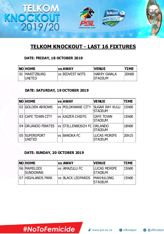 2019 Telkom Knockout Last 16 dates, venues and kick-off times Posted on 2019-10-10 By Thami Mshengu No Comments on 2019 Telkom Knockout Last 16 dates, venues and kick-off times (Visited 26 times, 1 visits today)Share this:TwitterWhatsAppPrintTumblrLinkedInFacebookTelegramRedditPocket Related Carling Knockout