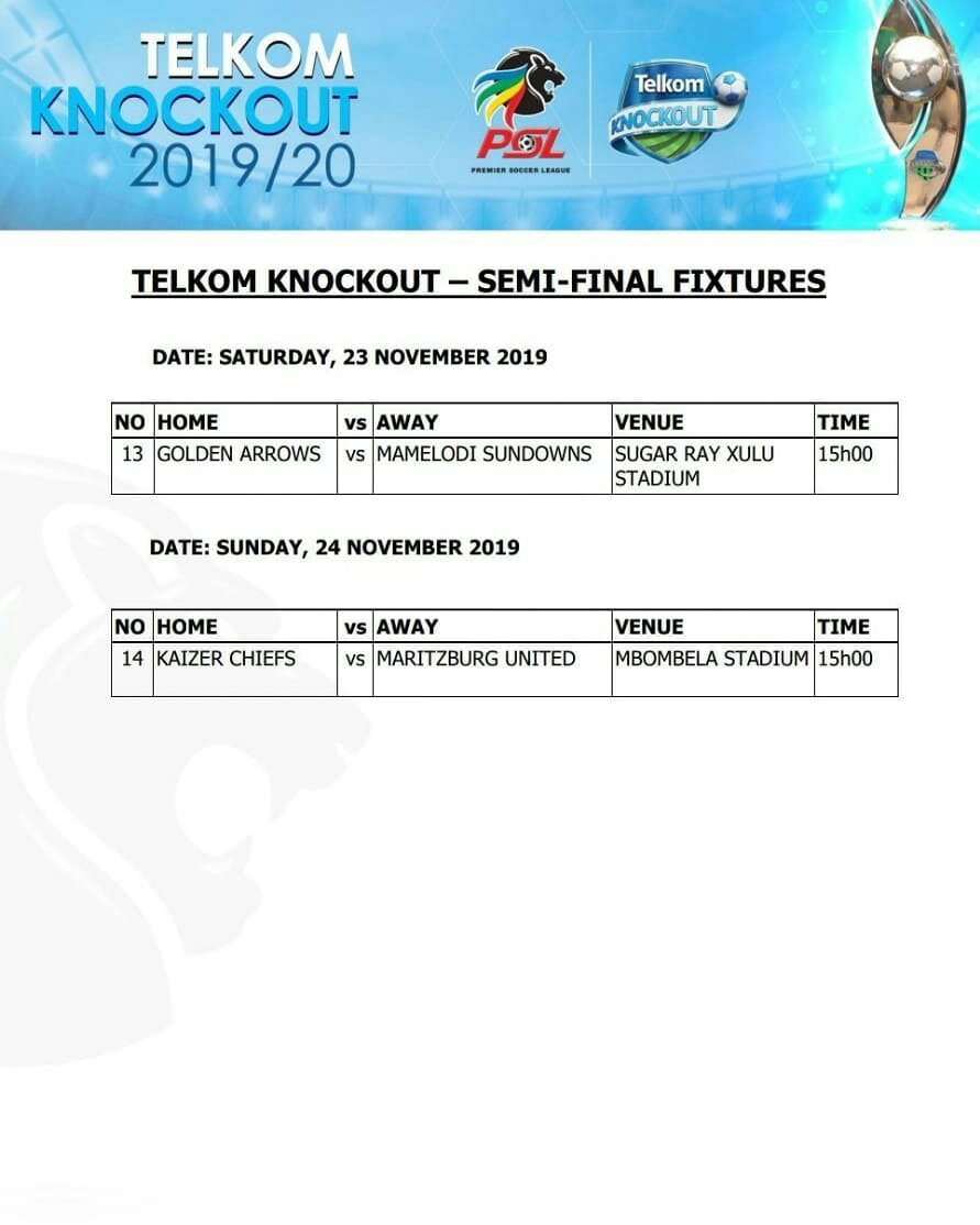 2019 Telkom Knockout Semi-Finals Dates, Venues and Kick-Off Times confirmed Posted on 2019-11-07 By Thami Mshengu No Comments on 2019 Telkom Knockout Semi-Finals Dates, Venues and Kick-Off Times confirmed (Visited 135 times, 1 visits today)Share this:TwitterWhatsAppPrintTumblrLinkedInFacebookTelegramRedditPocket Related Carling Knockout