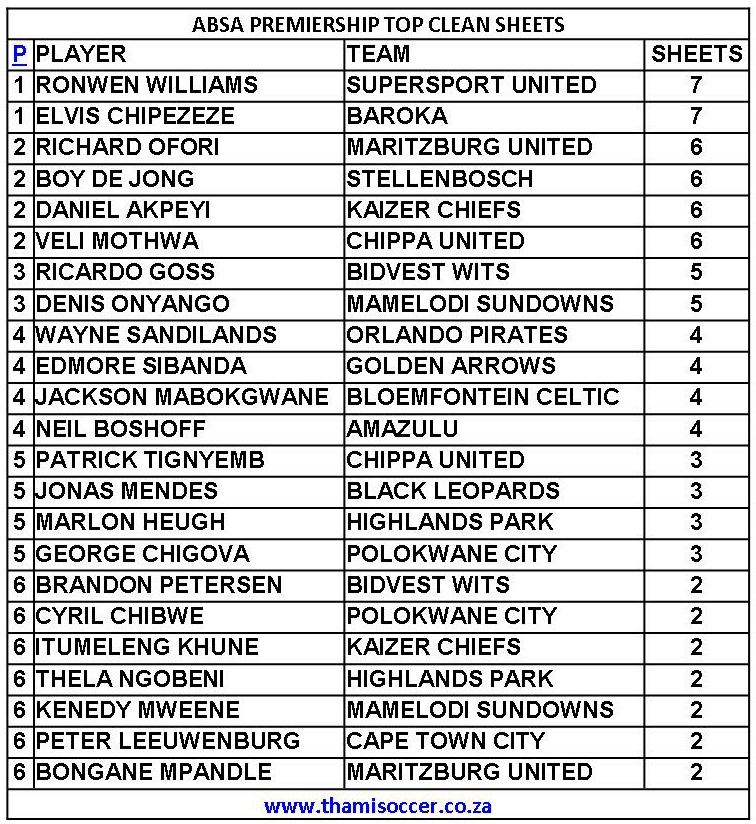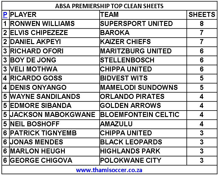 ABSA Premiership Top Clean Sheets 11 January 2020