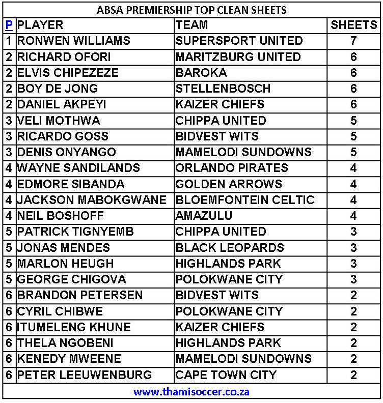 ABSA Premiership Top Clean Sheets 7 January 2020