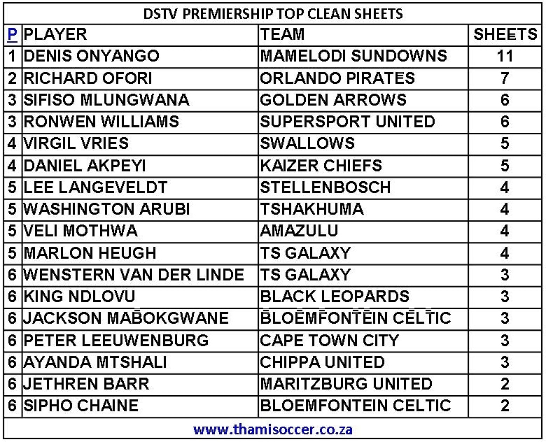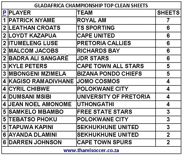 GladAfrica Championship Top Clean Sheets 7 March 2021