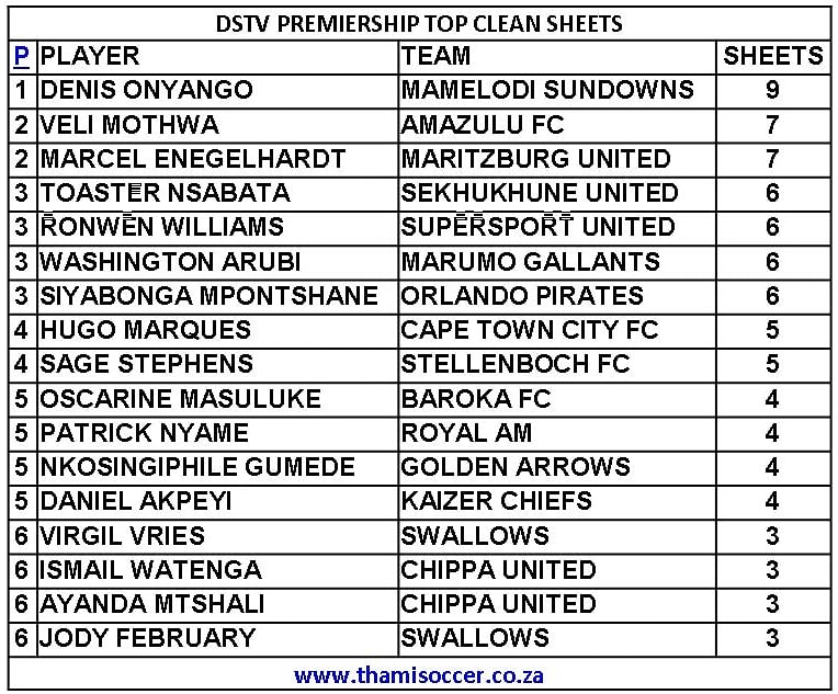 DStv Premiership Top Clean Sheets 12 December 2021