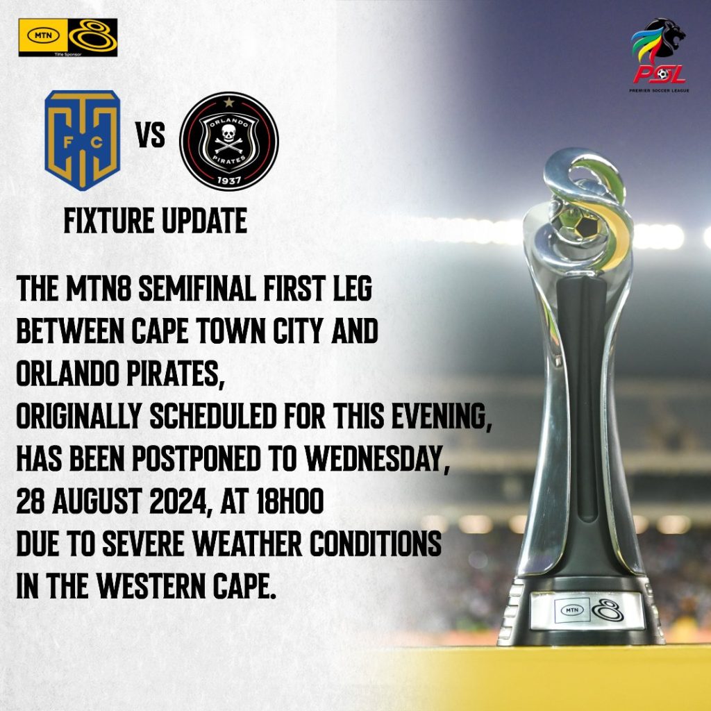 The 2024 MTN8 Semi-Final first leg between Cape Town City FC and Orlando Pirates, which was scheduled for Tuesday, 27 August 2024 at Cape Town Stadium, has been postponed to Wednesday, 28 August 2024, at 18h00 due to severe weather conditions in the Western Cape.