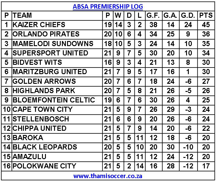 ABSA Premiership Log 12 February 2020 Posted on 2020-02-12 By Thami Mshengu No Comments on ABSA Premiership Log 12 February 2020 (Visited 24 times, 1 visits today)Share this:TwitterWhatsAppPrintTumblrLinkedInFacebookTelegramRedditPocket Related Betway Premiership