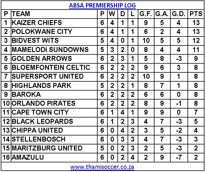 ABSA Premiership Log 24 September 2019 Posted on 2019-09-24 By Thami Mshengu 1 Comment on ABSA Premiership Log 24 September 2019 (Visited 20 times, 1 visits today)Share this:TwitterWhatsAppPrintTumblrLinkedInFacebookTelegramRedditPocket Related Betway Premiership