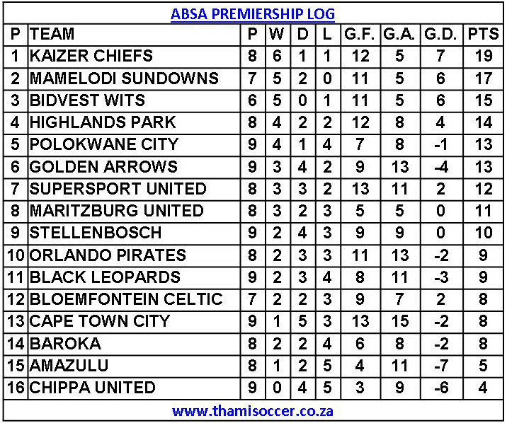 ABSA Premiership Log 26 October 2019 Posted on 2019-10-272019-10-27 By Thami Mshengu No Comments on ABSA Premiership Log 26 October 2019 (Visited 15 times, 1 visits today)Share this:TwitterWhatsAppPrintTumblrLinkedInFacebookTelegramRedditPocket Related Betway Premiership