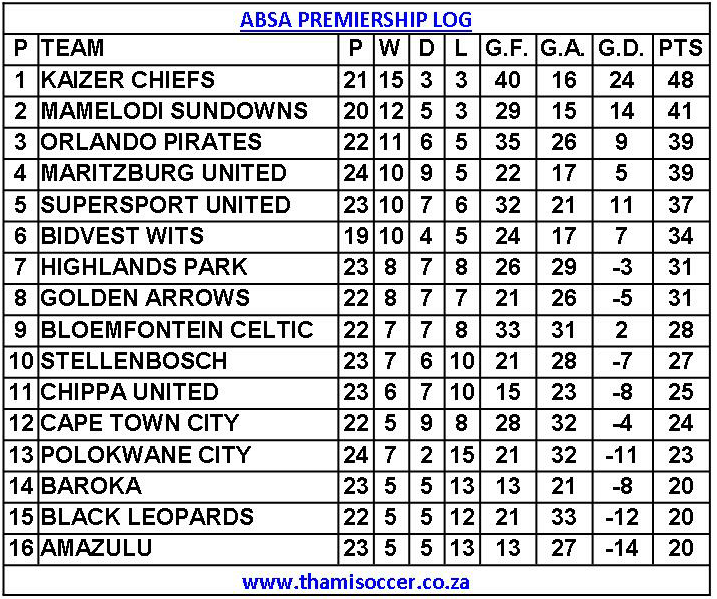 ABSA Premiership Log 6 March 2020 Posted on 2020-03-07 By Thami Mshengu No Comments on ABSA Premiership Log 6 March 2020 (Visited 40 times, 1 visits today)Share this:TwitterWhatsAppPrintTumblrLinkedInFacebookTelegramRedditPocket Related Betway Premiership
