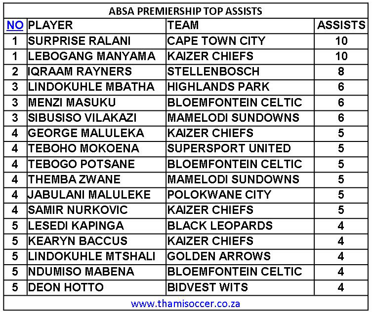 ABSA Premiership Top Assists 17 August 2020 Posted on 2020-08-182020-08-18 By Thami Mshengu No Comments on ABSA Premiership Top Assists 17 August 2020 (Visited 69 times, 1 visits today)Share this:TwitterWhatsAppPrintTumblrLinkedInFacebookTelegramRedditPocket Related Betway Premiership