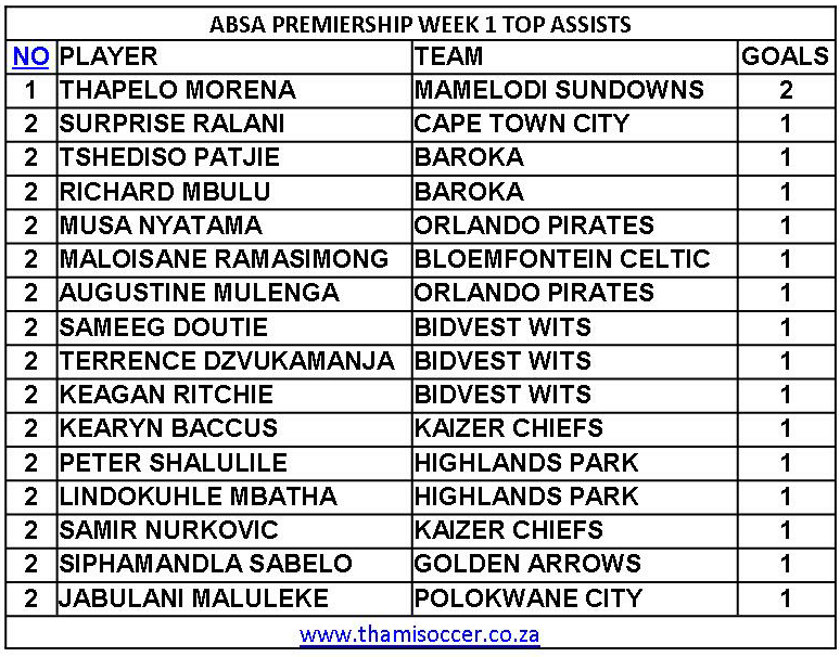ABSA Premiership Week 1 Top Assists Posted on 2019-08-052019-08-10 By Thami Mshengu No Comments on ABSA Premiership Week 1 Top Assists (Visited 21 times, 1 visits today)Share this:TwitterWhatsAppPrintTumblrLinkedInFacebookTelegramRedditPocket Related Betway Premiership