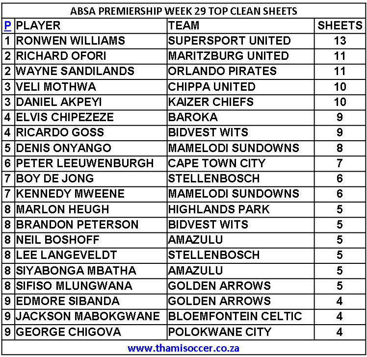 ABSA Premiership Top Clean Sheets 2 September 2020 Posted on 2020-09-032020-09-03 By Thami Mshengu No Comments on ABSA Premiership Top Clean Sheets 2 September 2020 (Visited 16 times, 1 visits today)Share this:TwitterWhatsAppPrintTumblrLinkedInFacebookTelegramRedditPocket Related Betway Premiership