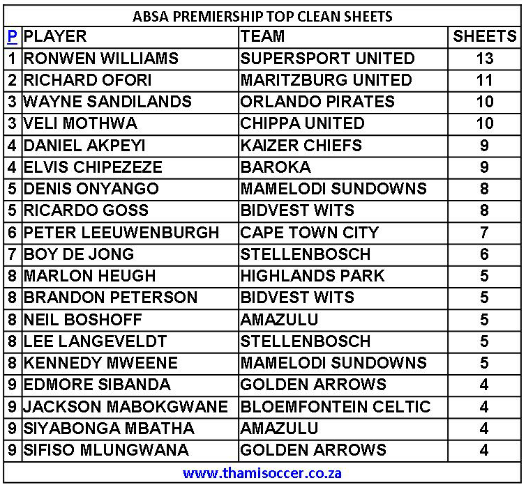 ABSA Premiership Top Clean Sheets 27 August 2020 Posted on 2020-08-282020-08-28 By Thami Mshengu No Comments on ABSA Premiership Top Clean Sheets 27 August 2020 (Visited 14 times, 1 visits today)Share this:TwitterWhatsAppPrintTumblrLinkedInFacebookTelegramRedditPocket Related Betway Premiership