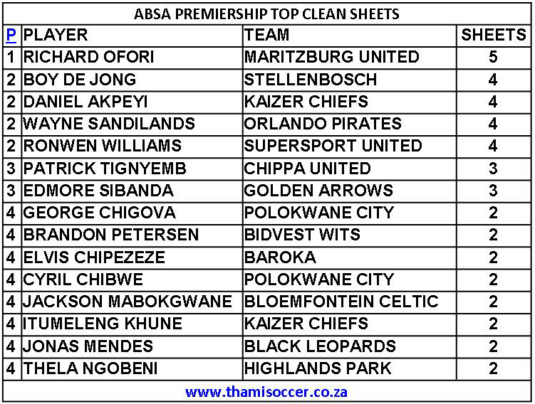 ABSA Premiership Top Clean Sheets 5 November 2019 Posted on 2019-11-06 By Thami Mshengu No Comments on ABSA Premiership Top Clean Sheets 5 November 2019 (Visited 14 times, 1 visits today)Share this:TwitterWhatsAppPrintTumblrLinkedInFacebookTelegramRedditPocket Related Betway Premiership