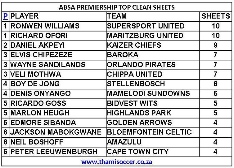 ABSA Premiership Top Clean Sheets 6 March 2020 Posted on 2020-03-07 By Thami Mshengu No Comments on ABSA Premiership Top Clean Sheets 6 March 2020 (Visited 15 times, 1 visits today)Share this:TwitterWhatsAppPrintTumblrLinkedInFacebookTelegramRedditPocket Related Betway Premiership
