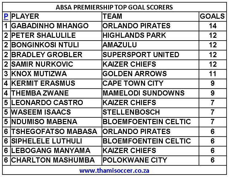 ABSA Premiership Top Goal Scorers 12 August 2020 Posted on 2020-08-122020-08-12 By Thami Mshengu No Comments on ABSA Premiership Top Goal Scorers 12 August 2020 (Visited 35 times, 1 visits today)Share this:TwitterWhatsAppPrintTumblrLinkedInFacebookTelegramRedditPocket Related Betway Premiership