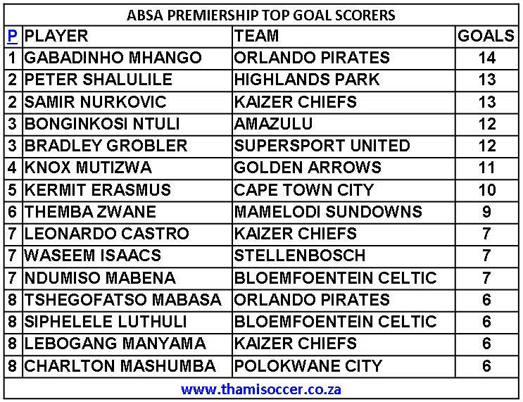 ABSA Premiership Top Goal Scorers 15 August 2020 Posted on 2020-08-152020-08-15 By Thami Mshengu No Comments on ABSA Premiership Top Goal Scorers 15 August 2020 (Visited 58 times, 1 visits today)Share this:TwitterWhatsAppPrintTumblrLinkedInFacebookTelegramRedditPocket Related Betway Premiership