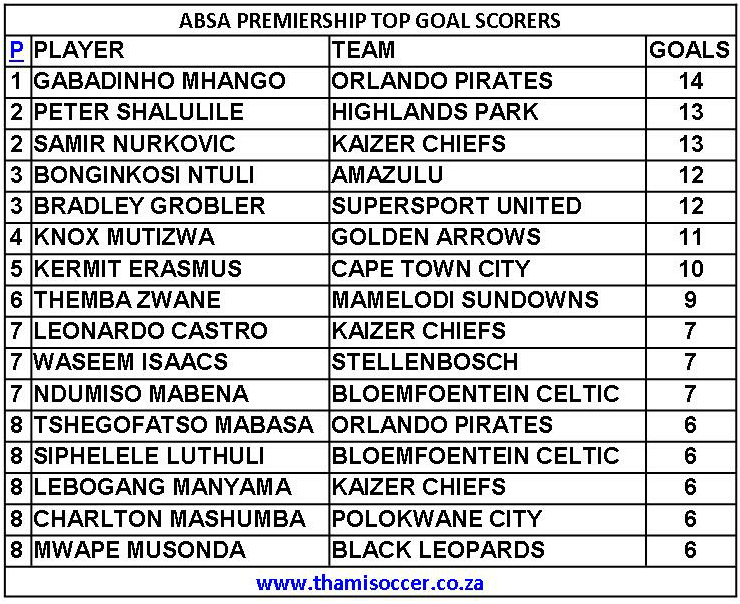ABSA Premiership Top Goal Scorers 16 August 2020 Posted on 2020-08-17 By Thami Mshengu No Comments on ABSA Premiership Top Goal Scorers 16 August 2020 (Visited 19 times, 1 visits today)Share this:TwitterWhatsAppPrintTumblrLinkedInFacebookTelegramRedditPocket Related Betway Premiership