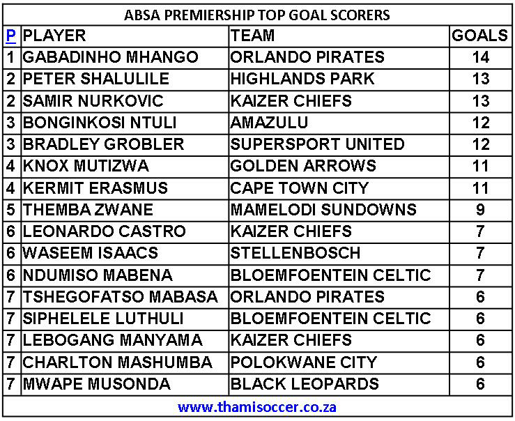 ABSA Premiership Top Goal Scorers 17 August 2020 Posted on 2020-08-172020-08-17 By Thami Mshengu No Comments on ABSA Premiership Top Goal Scorers 17 August 2020 (Visited 15 times, 1 visits today)Share this:TwitterWhatsAppPrintTumblrLinkedInFacebookTelegramRedditPocket Related Betway Premiership