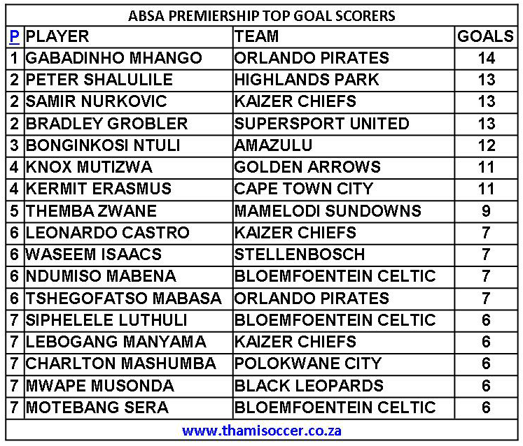 ABSA Premiership Top Goal Scorers 19 August 2020 Posted on 2020-08-202020-08-20 By Thami Mshengu 1 Comment on ABSA Premiership Top Goal Scorers 19 August 2020 (Visited 55 times, 1 visits today)Share this:TwitterWhatsAppPrintTumblrLinkedInFacebookTelegramRedditPocket Related Betway Premiership