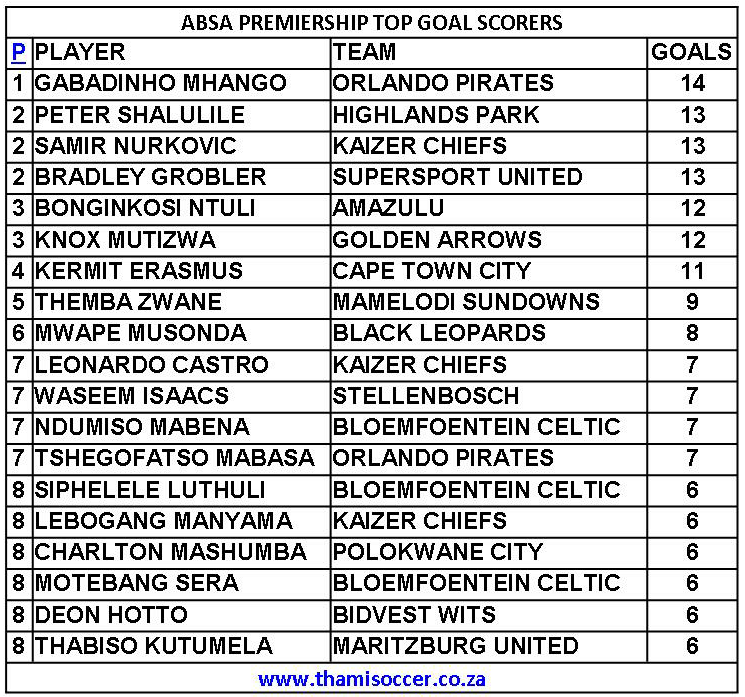 ABSA Premiership Top Goal Scorers 21 August 2020 Posted on 2020-08-222020-08-22 By Thami Mshengu No Comments on ABSA Premiership Top Goal Scorers 21 August 2020 (Visited 17 times, 1 visits today)Share this:TwitterWhatsAppPrintTumblrLinkedInFacebookTelegramRedditPocket Related Betway Premiership