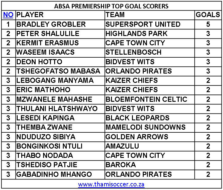 ABSA Premiership Top Goal Scorers 21 September 2019 Posted on 2019-09-222019-09-22 By Thami Mshengu 1 Comment on ABSA Premiership Top Goal Scorers 21 September 2019 (Visited 17 times, 1 visits today)Share this:TwitterWhatsAppPrintTumblrLinkedInFacebookTelegramRedditPocket Related Betway Premiership