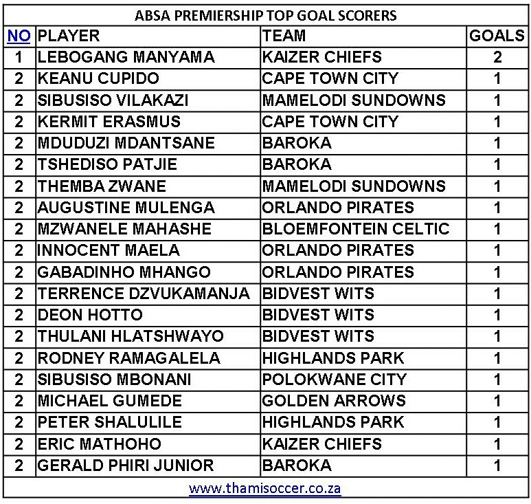 ABSA Premiership Top Goal Scorers 6 August 2019 Posted on 2019-08-06 By Thami Mshengu No Comments on ABSA Premiership Top Goal Scorers 6 August 2019 (Visited 27 times, 1 visits today)Share this:TwitterWhatsAppPrintTumblrLinkedInFacebookTelegramRedditPocket Related Betway Premiership