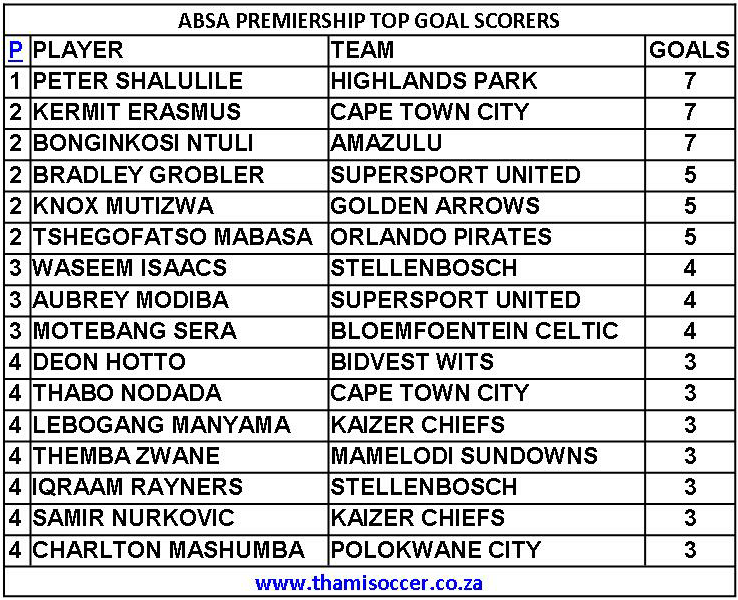 ABSA Premiership Top Goal Scorers 8 November 2019 Posted on 2019-11-09 By Thami Mshengu No Comments on ABSA Premiership Top Goal Scorers 8 November 2019 (Visited 21 times, 1 visits today)Share this:TwitterWhatsAppPrintTumblrLinkedInFacebookTelegramRedditPocket Related Betway Premiership