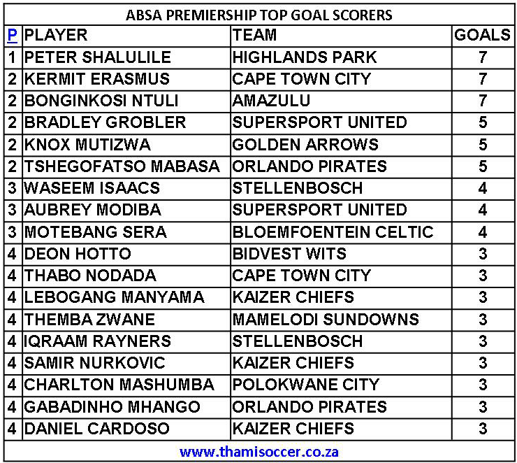 ABSA Premiership Top Goal Scorers 9 November 2019 Posted on 2019-11-10 By Thami Mshengu No Comments on ABSA Premiership Top Goal Scorers 9 November 2019 (Visited 12 times, 1 visits today)Share this:TwitterWhatsAppPrintTumblrLinkedInFacebookTelegramRedditPocket Related Betway Premiership