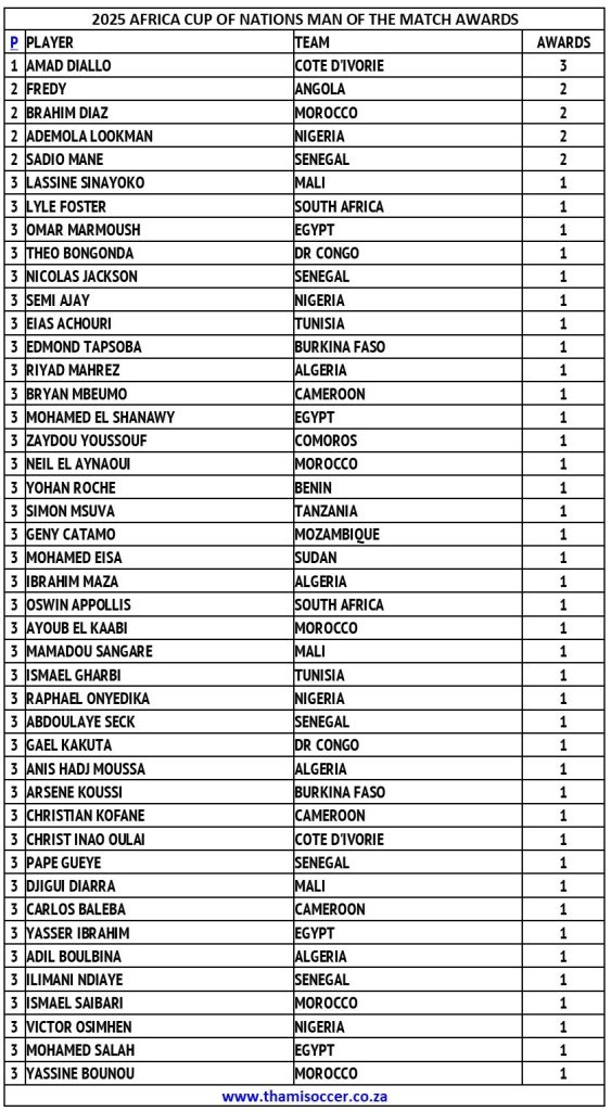 Africa Cup Of Nations Man Of The Match Awards 14 January 2026 Posted on 2026-01-152026-01-15 By Thami Mshengu No Comments on Africa Cup Of Nations Man Of The Match Awards 14 January 2026 (Visited 13 times, 1 visits today)Share this:TwitterWhatsAppPrintTumblrLinkedInFacebookTelegramRedditPocket Related Africa Cup of Nations Tags:Amad Diallo
