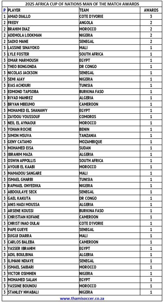 Africa Cup Of Nations Man Of The Match Awards 17 January 2026 Posted on 2026-01-172026-01-18 By Thami Mshengu No Comments on Africa Cup Of Nations Man Of The Match Awards 17 January 2026 (Visited 14 times, 2 visits today)Share this:TwitterWhatsAppPrintTumblrLinkedInFacebookTelegramRedditPocket Related Africa Cup of Nations Tags:Amad Diallo