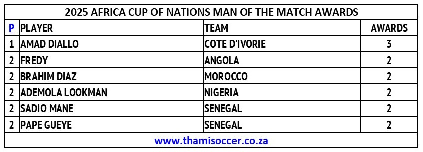 Africa Cup Of Nations Man Of The Match Awards 18 January 2026 Posted on 2026-01-182026-01-19 By Thami Mshengu No Comments on Africa Cup Of Nations Man Of The Match Awards 18 January 2026 (Visited 11 times, 11 visits today)Share this:TwitterWhatsAppPrintTumblrLinkedInFacebookTelegramRedditPocket Related Africa Cup of Nations Tags:Amad Diallo