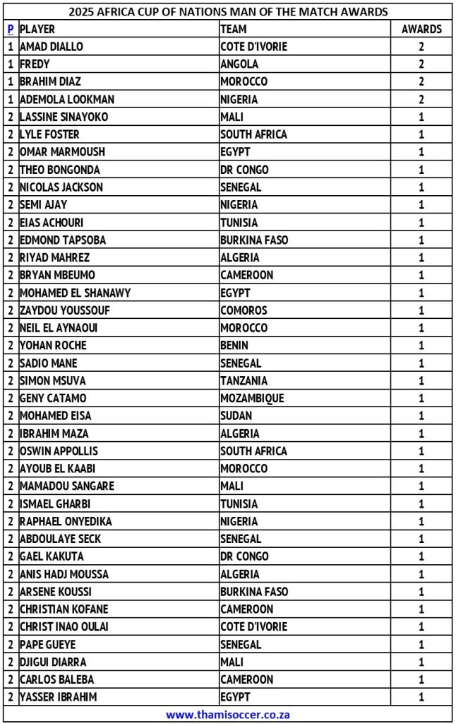 Africa Cup Of Nations Man Of The Match Awards 5 January 2026 Posted on 2026-01-052026-01-06 By Thami Mshengu No Comments on Africa Cup Of Nations Man Of The Match Awards 5 January 2026 (Visited 41 times, 1 visits today)Share this:TwitterWhatsAppPrintTumblrLinkedInFacebookTelegramRedditPocket Related Africa Cup of Nations Tags:Ademola Lookman, Amad Diallo, Brahim Diaz, Fredy