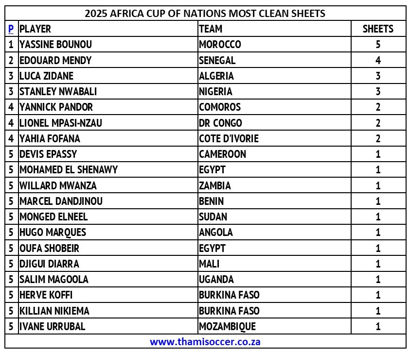 Africa Cup Of Nations Most Clean Sheets 14 January 2026 Posted on 2026-01-152026-01-15 By Thami Mshengu No Comments on Africa Cup Of Nations Most Clean Sheets 14 January 2026 (Visited 41 times, 1 visits today)Share this:TwitterWhatsAppPrintTumblrLinkedInFacebookTelegramRedditPocket Related Africa Cup of Nations Tags:Yassine Bounou