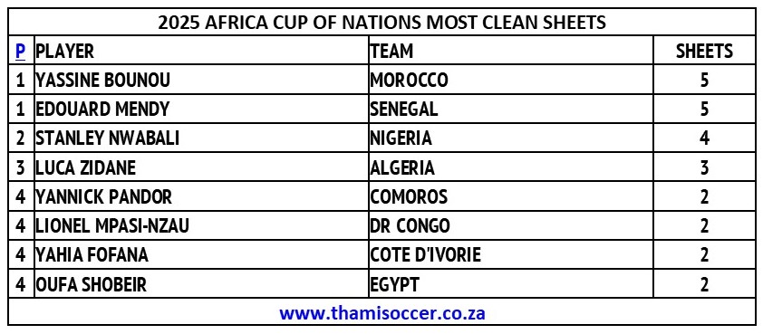 Africa Cup Of Nations Most Clean Sheets 18 January 2026 Posted on 2026-01-182026-01-19 By Thami Mshengu No Comments on Africa Cup Of Nations Most Clean Sheets 18 January 2026 (Visited 12 times, 12 visits today)Share this:TwitterWhatsAppPrintTumblrLinkedInFacebookTelegramRedditPocket Related Africa Cup of Nations Tags:Edouard Mendy, Yassine Bounou