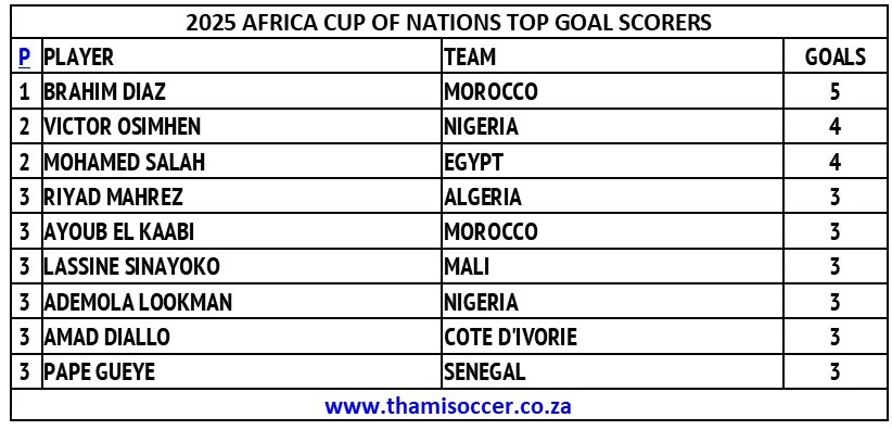 Africa Cup Of Nations Top Goal Scorers 18 January 2026 Posted on 2026-01-192026-01-19 By Thami Mshengu No Comments on Africa Cup Of Nations Top Goal Scorers 18 January 2026 (Visited 15 times, 15 visits today)Share this:TwitterWhatsAppPrintTumblrLinkedInFacebookTelegramRedditPocket Related Africa Cup of Nations Tags:Brahim Diaz