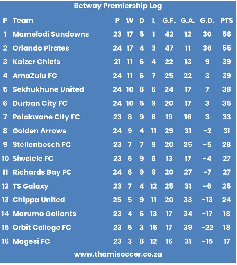 Betway Premiership Log 11 April 2026 Posted on 2026-04-112026-04-12 By Thami Mshengu No Comments on Betway Premiership Log 11 April 2026 (Visited 17 times, 1 visits today)Share this:TwitterWhatsAppPrintTumblrLinkedInFacebookTelegramRedditPocket Related Betway Premiership Tags:Mamelodi Sundowns