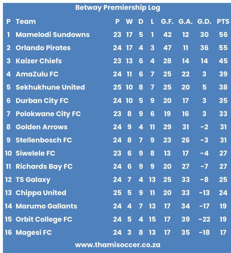 Betway Premiership Log 17 April 2026 Posted on 2026-04-172026-04-18 By Thami Mshengu No Comments on Betway Premiership Log 17 April 2026 (Visited 10 times, 10 visits today)Share this:TwitterWhatsAppPrintTumblrLinkedInFacebookTelegramRedditPocket Related Betway Premiership Tags:Mamelodi Sundowns