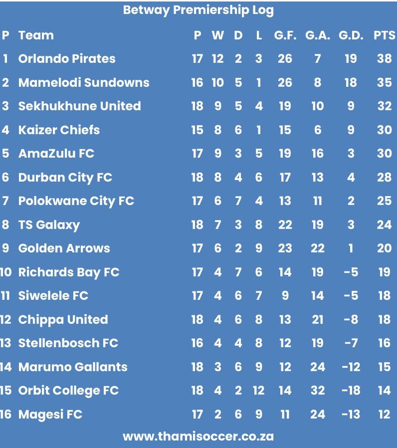 Betway Premiership Log 18 February 2026 Posted on 2026-02-182026-02-18 By Thami Mshengu No Comments on Betway Premiership Log 18 February 2026 (Visited 37 times, 1 visits today)Share this:TwitterWhatsAppPrintTumblrLinkedInFacebookTelegramRedditPocket Related Betway Premiership Tags:Orlando Pirates