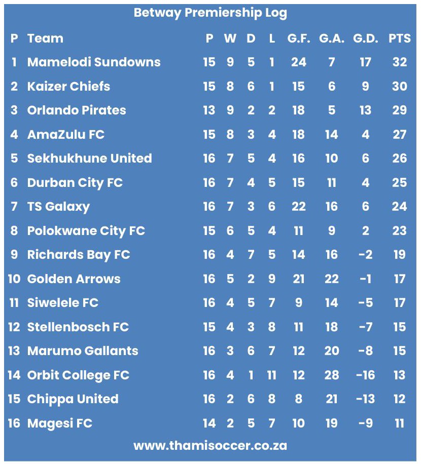 Betway Premiership Log 30 January 2026 Posted on 2026-01-302026-01-30 By Thami Mshengu No Comments on Betway Premiership Log 30 January 2026 (Visited 8 times, 5 visits today)Share this:TwitterWhatsAppPrintTumblrLinkedInFacebookTelegramRedditPocket Related Betway Premiership Tags:Mamelodi Sundowns