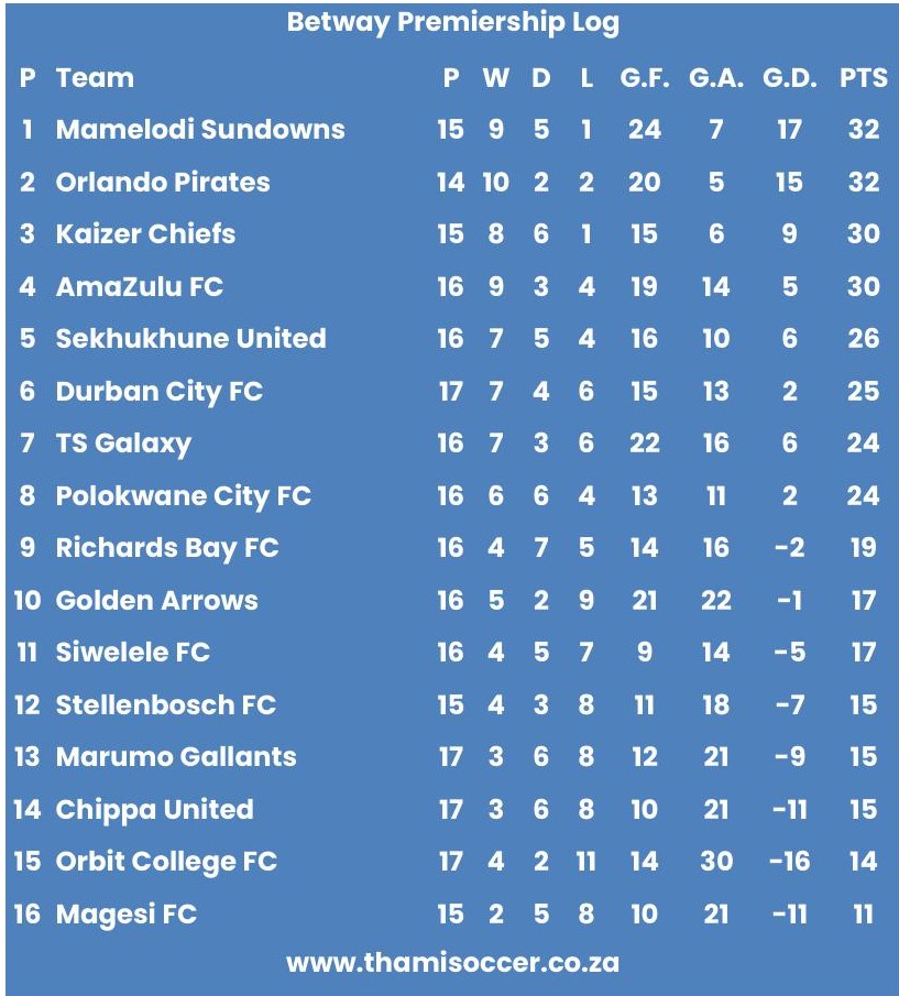 Betway Premiership Log 31 January 2026 Posted on 2026-01-312026-02-01 By Thami Mshengu No Comments on Betway Premiership Log 31 January 2026 (Visited 11 times, 11 visits today)Share this:TwitterWhatsAppPrintTumblrLinkedInFacebookTelegramRedditPocket Related Betway Premiership Tags:Mamelodi Sundowns