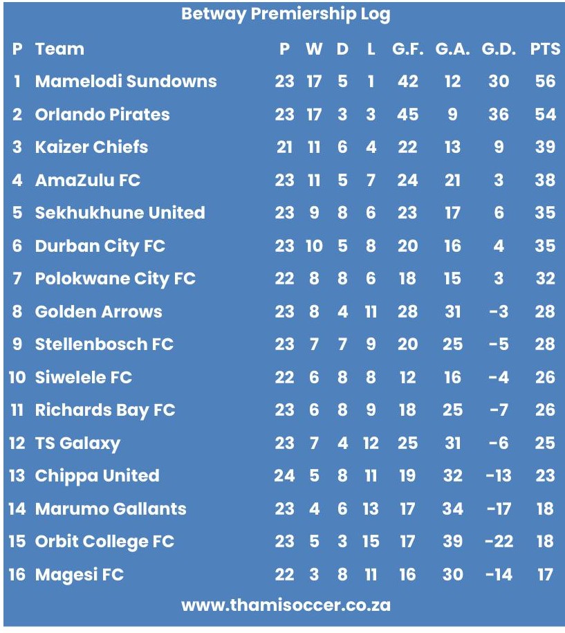 Betway Premiership Log 8 April 2026 Posted on 2026-04-082026-04-09 By Thami Mshengu No Comments on Betway Premiership Log 8 April 2026 (Visited 29 times, 1 visits today)Share this:TwitterWhatsAppPrintTumblrLinkedInFacebookTelegramRedditPocket Related Betway Premiership Tags:Mamelodi Sundowns