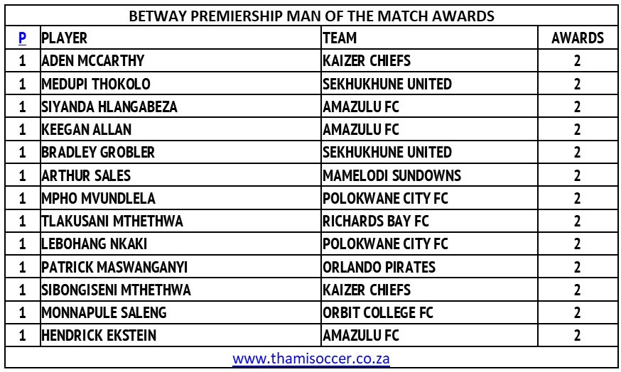 Betway Premiership Man Of The Match Awards 1 November 2025 Posted on 2025-11-012025-11-06 By Thami Mshengu No Comments on Betway Premiership Man Of The Match Awards 1 November 2025 (Visited 7 times, 1 visits today)Share this:TwitterWhatsAppPrintTumblrLinkedInFacebookTelegramRedditPocket Related Betway Premiership Tags:Aden McCarthy, Arthur de Oliveira Sales, Bradley Grobler, Hendrick Ekstein, Keegan Allan, Lebohang Nkaki, Medupi Thokolo, Monnapule Saleng, Mpho Mvundlela, Patrick Maswanganyi, Sibongiseni Mthethwa, Siyanda Hlangabeza, Tlakusani Mthethwa