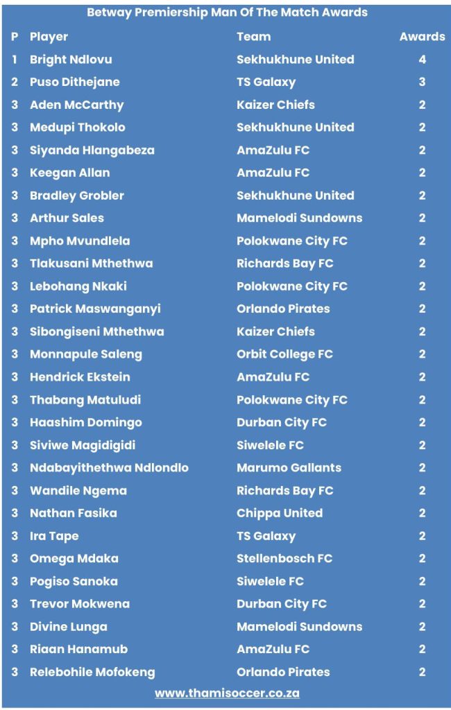 Betway Premiership Man Of The Match Awards 31 January 2026 Posted on 2026-01-312026-02-01 By Thami Mshengu No Comments on Betway Premiership Man Of The Match Awards 31 January 2026 (Visited 10 times, 10 visits today)Share this:TwitterWhatsAppPrintTumblrLinkedInFacebookTelegramRedditPocket Related Betway Premiership Tags:Bright Ndlovu