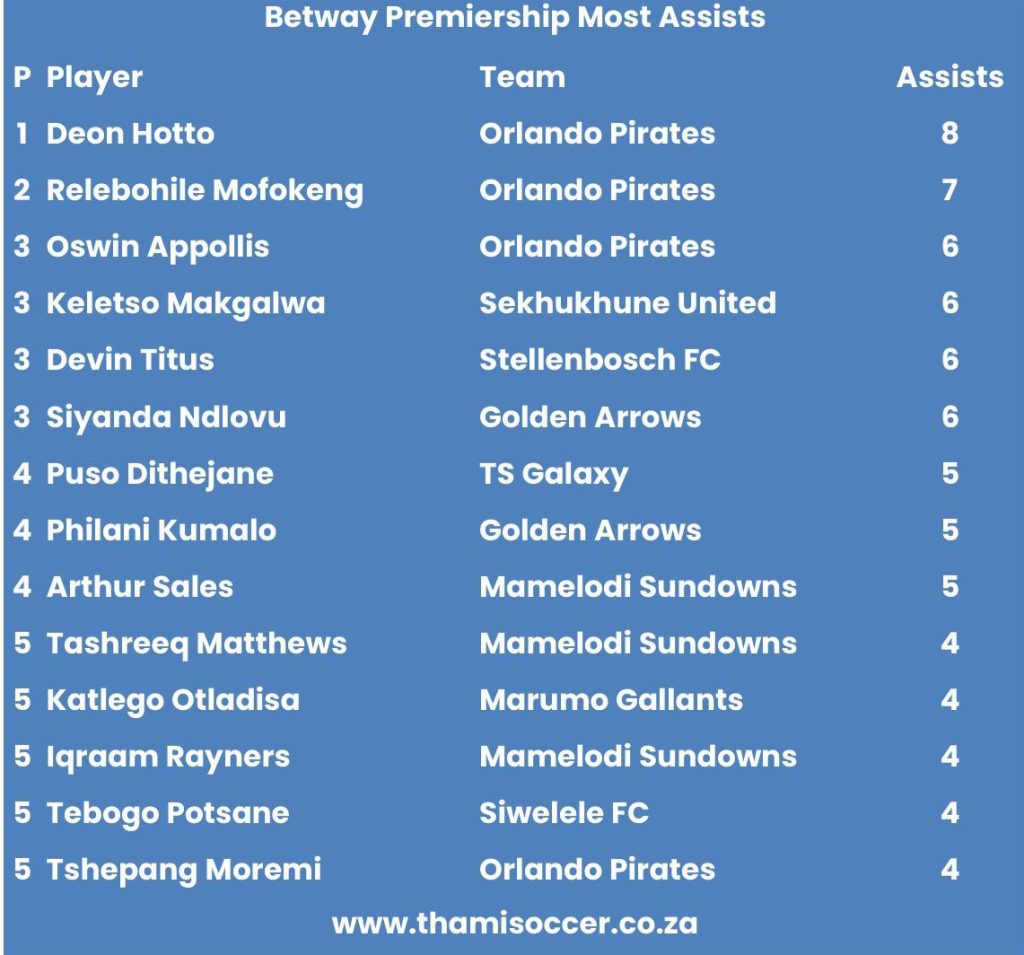 Betway Premiership Most Assists 22 April 2026 Posted on 2026-04-222026-04-23 By Thami Mshengu No Comments on Betway Premiership Most Assists 22 April 2026 (Visited 14 times, 14 visits today)Share this:TwitterWhatsAppPrintTumblrLinkedInFacebookTelegramRedditPocket Related Betway Premiership Tags:Deon Hotto
