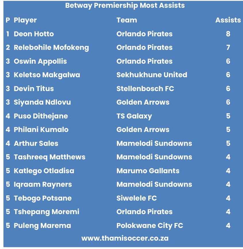 Betway Premiership Most Assists 26 April 2026 Posted on 2026-04-262026-04-27 By Thami Mshengu No Comments on Betway Premiership Most Assists 26 April 2026 (Visited 11 times, 11 visits today)Share this:TwitterWhatsAppPrintTumblrLinkedInFacebookTelegramRedditPocket Related Betway Premiership Tags:Deon Hotto
