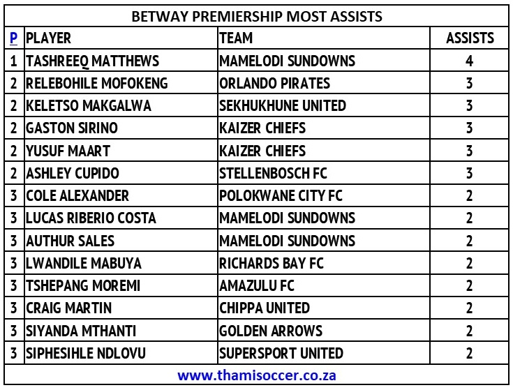 Betway Premiership Most Assists 6 December 2024 Posted on 2024-12-062024-12-07 By Thami Mshengu No Comments on Betway Premiership Most Assists 6 December 2024 (Visited 68 times, 1 visits today)Share this:TwitterWhatsAppPrintTumblrLinkedInFacebookTelegramRedditPocket Related Betway Premiership Tags:Tashreeq Matthews