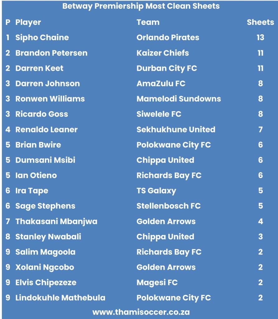 Betway Premiership Most Clean Sheets 1 March 2026 Posted on 2026-03-012026-03-01 By Thami Mshengu No Comments on Betway Premiership Most Clean Sheets 1 March 2026 (Visited 18 times, 1 visits today)Share this:TwitterWhatsAppPrintTumblrLinkedInFacebookTelegramRedditPocket Related Betway Premiership Tags:Sipho Chaine