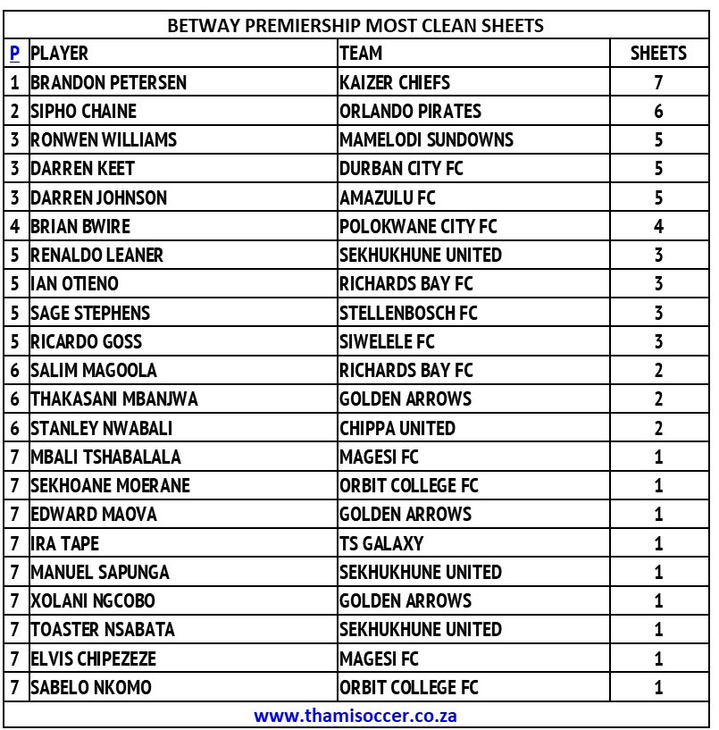 Betway Premiership Most Clean Sheets 1 November 2025 Posted on 2025-11-012025-11-06 By Thami Mshengu No Comments on Betway Premiership Most Clean Sheets 1 November 2025 (Visited 6 times, 1 visits today)Share this:TwitterWhatsAppPrintTumblrLinkedInFacebookTelegramRedditPocket Related Betway Premiership Tags:Brandon Petersen