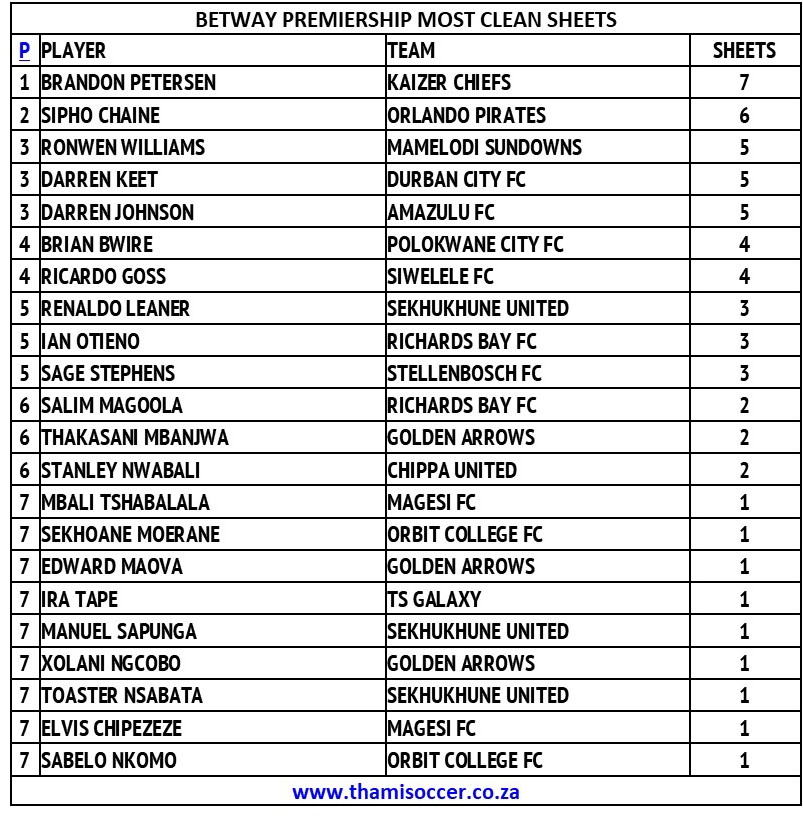 Betway Premiership Most Clean Sheets 1 November 2025 Posted on 2025-11-012025-11-19 By Thami Mshengu No Comments on Betway Premiership Most Clean Sheets 1 November 2025 (Visited 26 times, 1 visits today)Share this:TwitterWhatsAppPrintTumblrLinkedInFacebookTelegramRedditPocket Related Betway Premiership Tags:Brandon Petersen