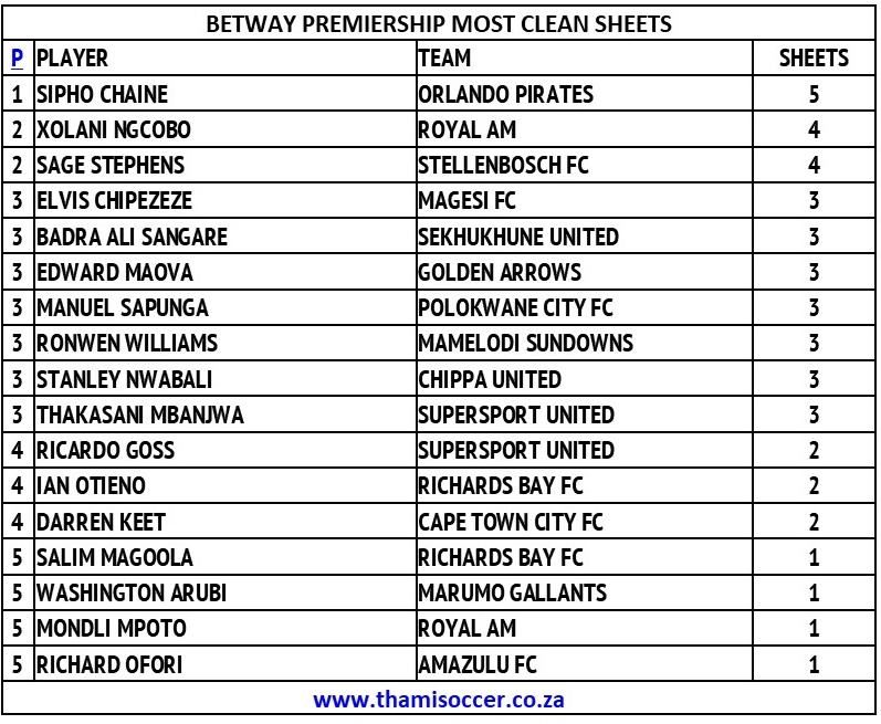 Betway Premiership Most Clean Sheets 26 November 2024 Posted on 2024-11-262024-11-27 By Thami Mshengu No Comments on Betway Premiership Most Clean Sheets 26 November 2024 (Visited 131 times, 1 visits today)Share this:TwitterWhatsAppPrintTumblrLinkedInFacebookTelegramRedditPocket Related Betway Premiership Tags:Sipho Chaine